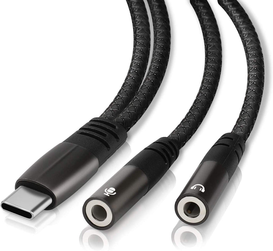 A USB-C headphone splitter is typically required when connecting a microphone to a newer smartphone. It will connect two separate TRS connectors, one for the microphone and one for the headphones, to the USB-C plug on the phone.